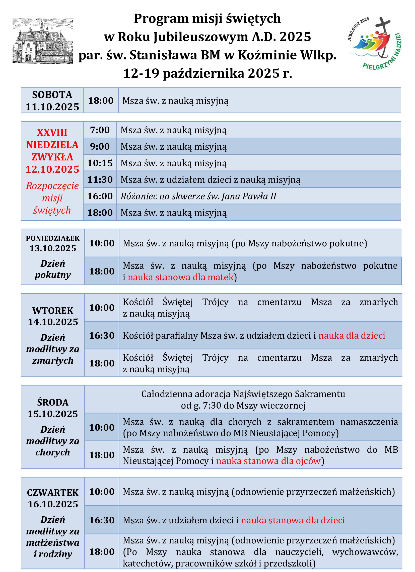 - W sobotę 11 października podczas Mszy św. wieczornej rozpoczynamy w naszej parafii wyjątkowy czas parafialnych misji świętych w Roku Jubileuszowym, pt. Rodzina Bogiem silna. Ostatnie misje w naszej parafii odbyły się z okazji peregrynacji obrazu Matki Bożej Częstochowskiej, czyli ponad 15 lat temu. Dlatego zechciejmy jak najlepiej przeżyć ten święty czas, w którym będzie nas prowadził misjonarz ks. Stanisław Gawlicki, filipin z Bazyliki Matki Bożej na Świętej Górze w Gostyniu, którego serdecznie witamy w naszej rodzinie parafialnej. Plan misji świętych dostępny jest w gablotach oraz na stronie internetowej parafii.