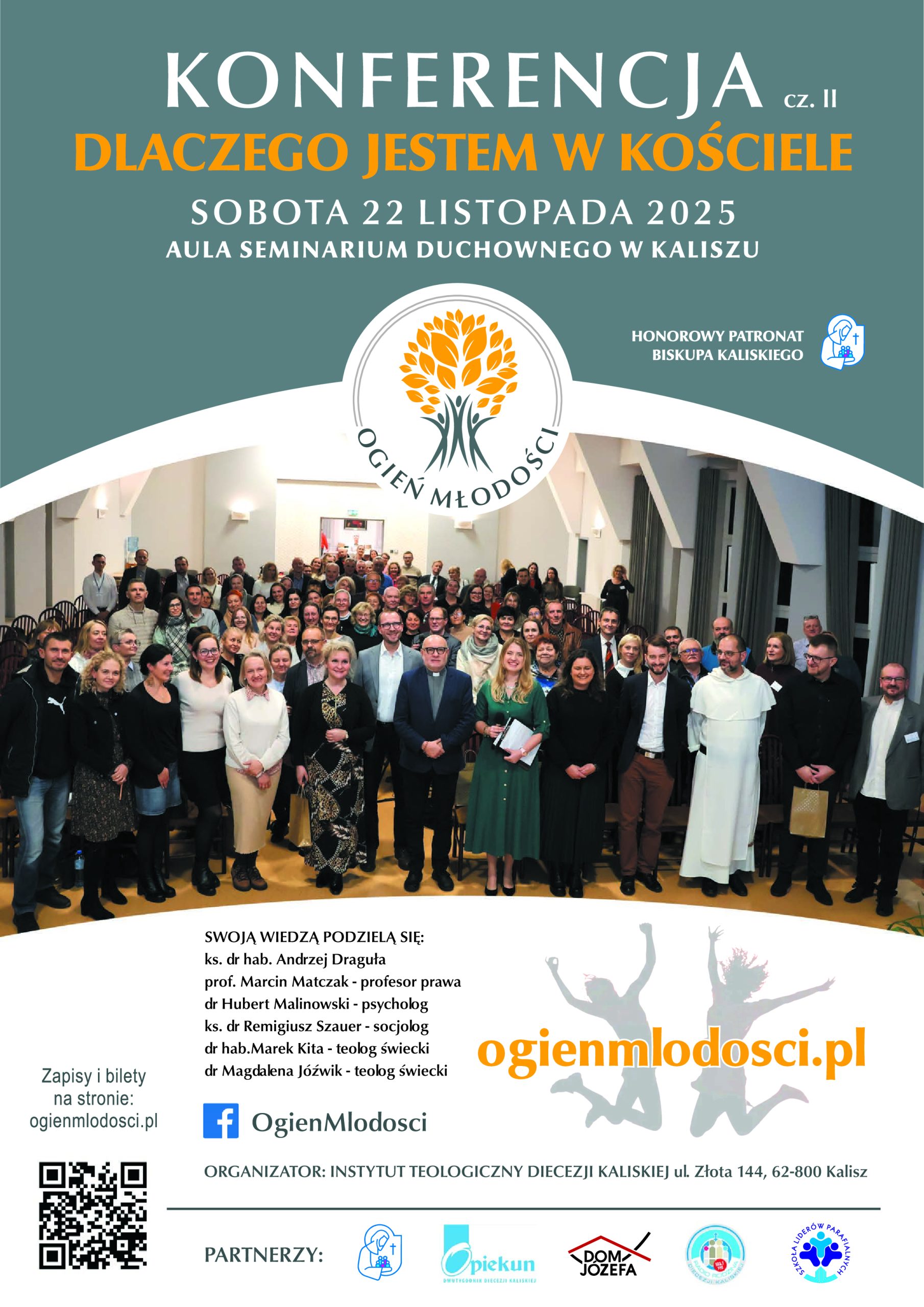 - Jeżeli szukasz odpowiedzi na pytanie: co mi dzisiaj daje bycie w Kościele i jak to się przekłada na moje życie i relacje z ludźmi? To zapraszamy do udziału w wydarzeniu, podczas którego, przy udziale uznanych w Polsce autorytetów, spróbujemy odkryć, co Kościół może dać współczesnemu człowiekowi. Spotkanie odbędzie się w sobotę 22 listopada w auli Wyższego Seminarium Duchownego w Kaliszu. Zapisy do 16 listopada, przez stronę www.ognienmlodosci.pl