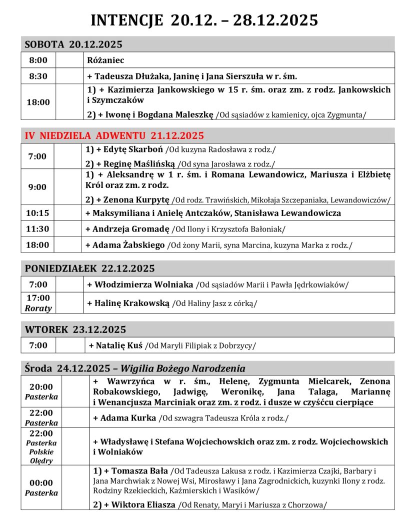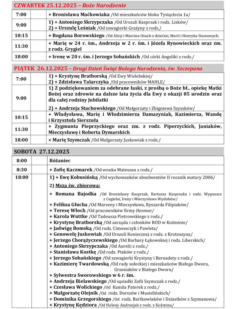 | 18:00 | 1) + Anielę w 3 r. śm., Kazimierza i Ryszarda Ratajskich 2) + Czesława Plutę /Od wnuczki Martyny z rodz./ | |
