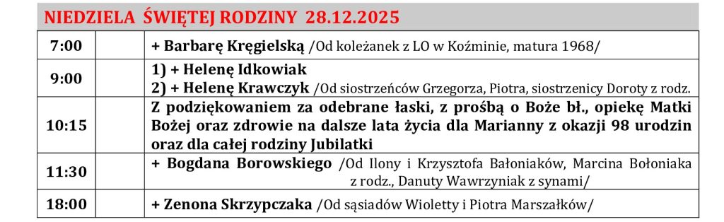 | 18:00 | Msza św. zbiorowa: + Violettę Kowal /Od rodz. Małuszków z Biadek/ + Sylwestra Sworowskiego /Od sąsiadów z ul. Towarowej 2/ + Mariana Dyndasa /Od rodz. Maryniaków/ + Jadwigę Wasik i zm. z Bloku nr 5 /Od mieszkańców Bloku nr 5/ + Jadwigę Daros /Od rodz. Kempów z ul. Tysiąclecia/ + Grażynę Walczak /Od kuzynki Emilii z rodz., Aldony i Ireneusza z rodz./ + Anielę Gołąbek /Od Mariusza i Hanny Jackowiaków z rodz./ + Iwonę Majdecką /Od Renaty i Eugeniusza Binek/ + Sabinę Kaźmierczak /Od wnuków Jakuba i Marka z rodz./ + Annę Krzyżaniak /Od matki chrzestnej/ + Teresę Sokołowską /Od brata Janusza z żoną/ | |