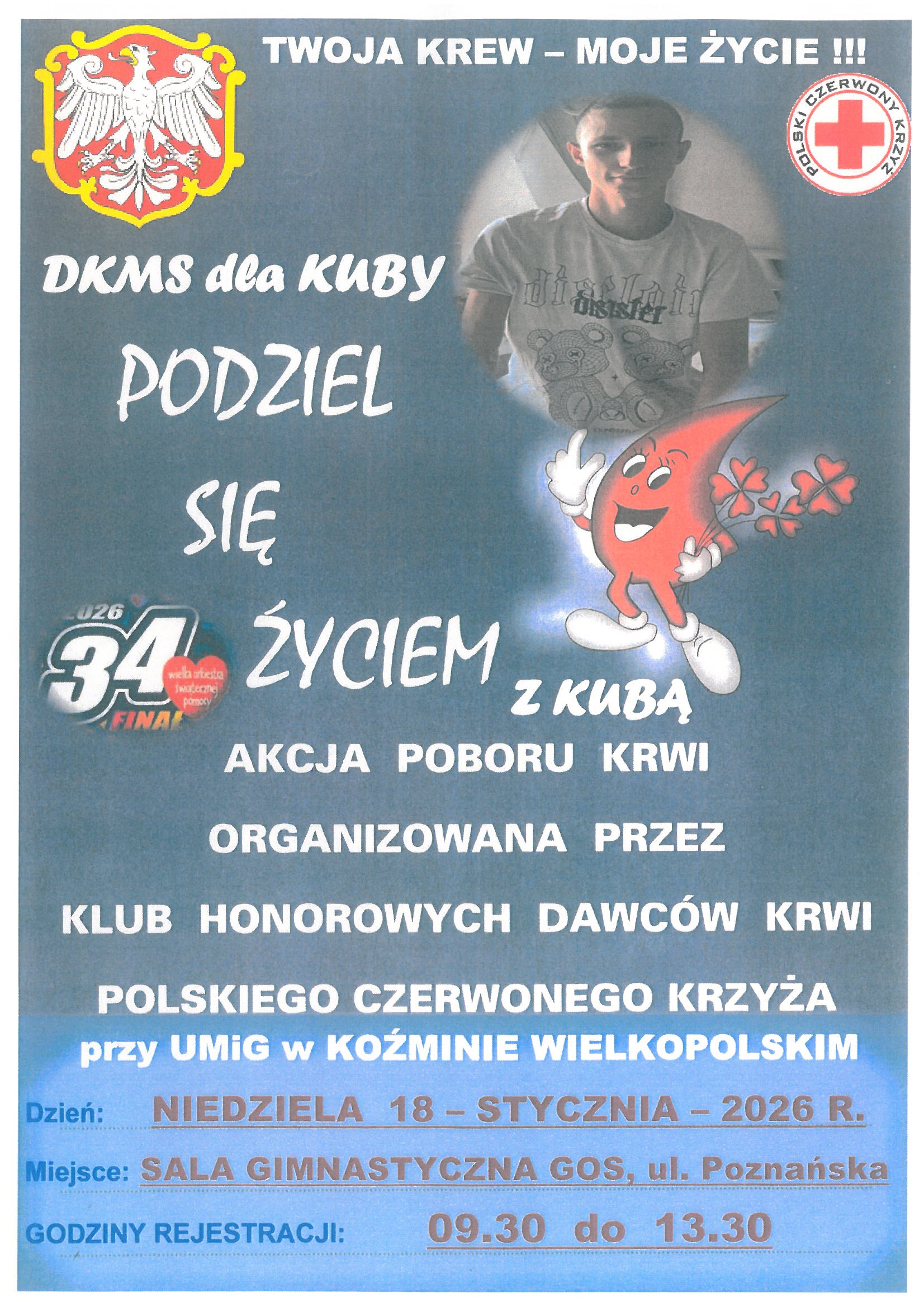 - Również w przyszłą niedzielę 18 stycznia w sali gimnastycznej Gminnego Ośrodka Sportu w Koźminie, wejście od ul. Poznańskiej w godz. 9:30-13:30 odbędzie się akcja poboru krwi. Zbiórka krwi dedykowana jest pochodzącemu z Koźmina 19-letniemu Kubie Żychlińskiemu, który walczy z białaczką limfatyczną. Szczegóły na plakacie.
