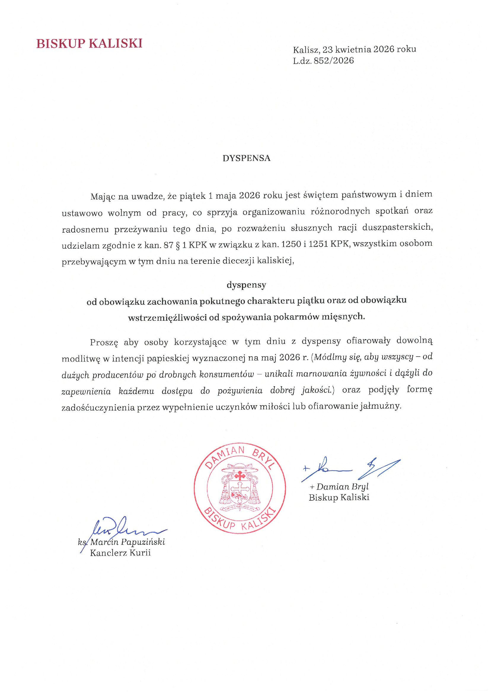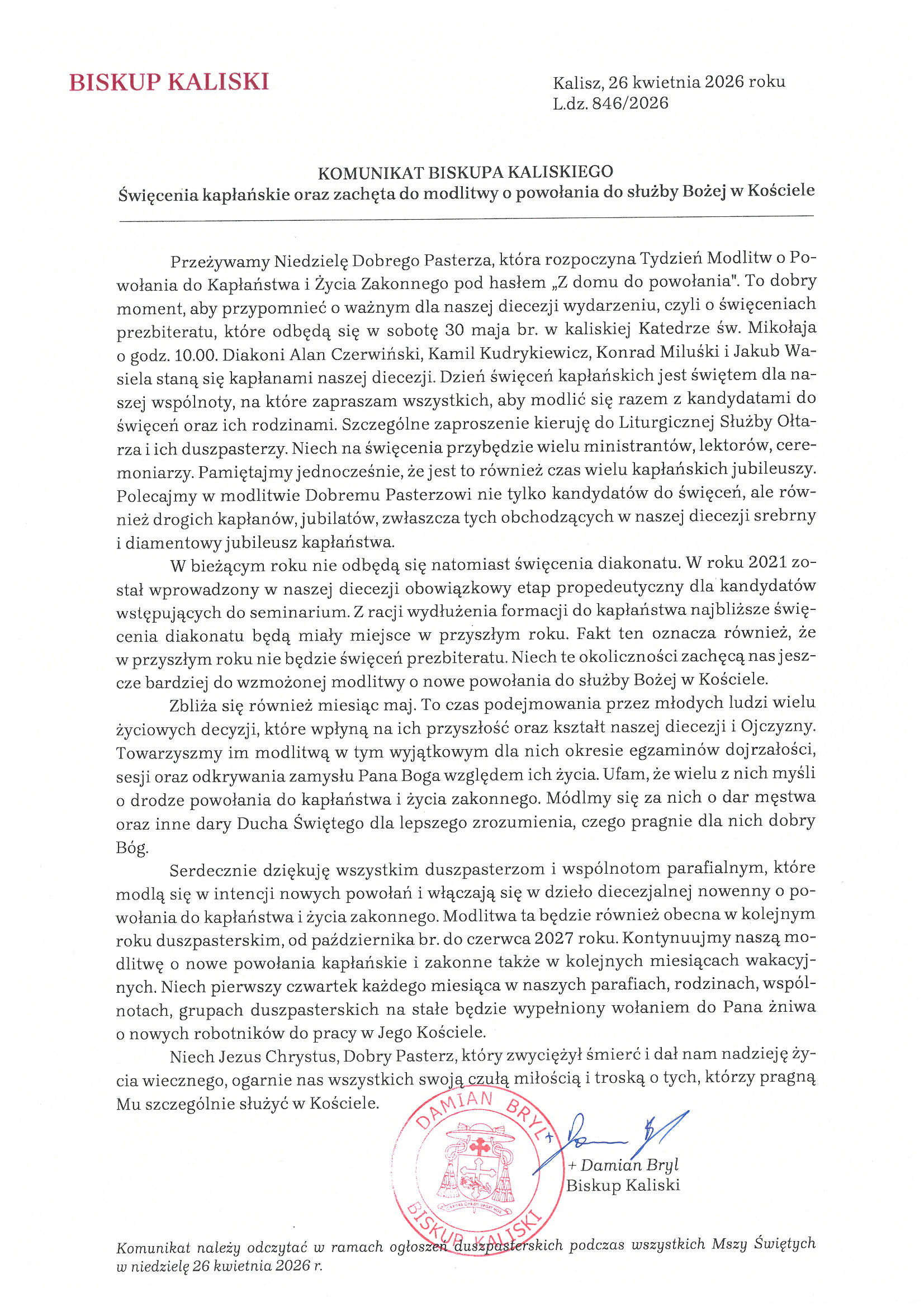 12. Komunikat Księdza Biskupa odnośnie dyspensy w piątek 01 maja oraz tegorocznych święceń kapłańskich.